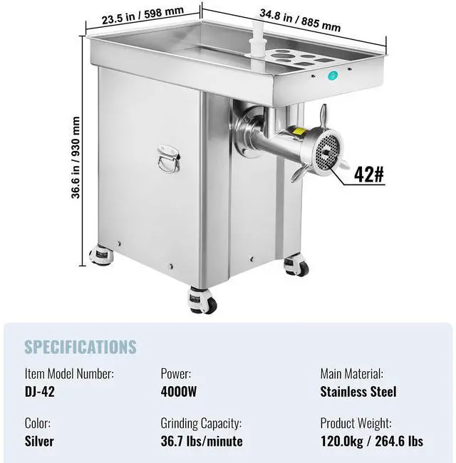 Color: Silver,Item Model Number: DJ-42,Product Weight: 264.6 lbs / 120.0 kg,Grinding Capacity: 36.7 lbs/minute,Mouth Size: 42#,Power: 4000W,Main Material: Stainless Steel,Product Size: 36.6 x 23.5 x 34.8 inch / 930 x 598 x 885 mm