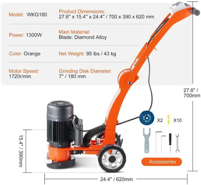 Motor Speed:1720r/min,Grinding Disk Diameter: 7'' / 180 mm,Color: Orange,Model: WKG180,Product Dimensions: 27.6'' x 15.4'' x 24.4'' / 700 x 390 x 620 mm,Net Weight: 95 lbs / 43 kg,Power: 1300W,Main Material: Blade: Diamond, Diamond Alloy