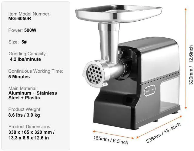 Size: 5#,Item Model Number: MG-6050R,Product Weight: 8.6 lbs / 3.9 kg,Grinding Capacity: 4.2 lbs/minute,Continuous Working Time: 5 Minutes,Power: 500W,Main Material: Aluminum + Stainless Steel + Plastic,Product Size: 13.3 x 6.5 x 12.6 inches / 338 x 165 x 320 mm