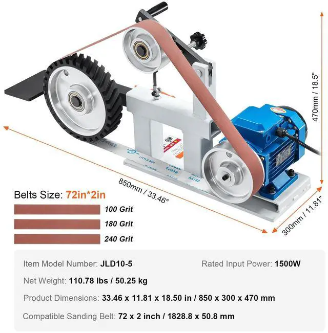 Rated Input Power: 1500W,Compatible Sanding Belt: 72 x 2 inch / 1828.8 x 50.8 mm,Item Model Number: JLD10-5,Product Dimensions: 33.46 x 11.81 x 18.50 in / 850 x 300 x 470 mm,Net Weight: 110.78 lbs / 50.25 kg