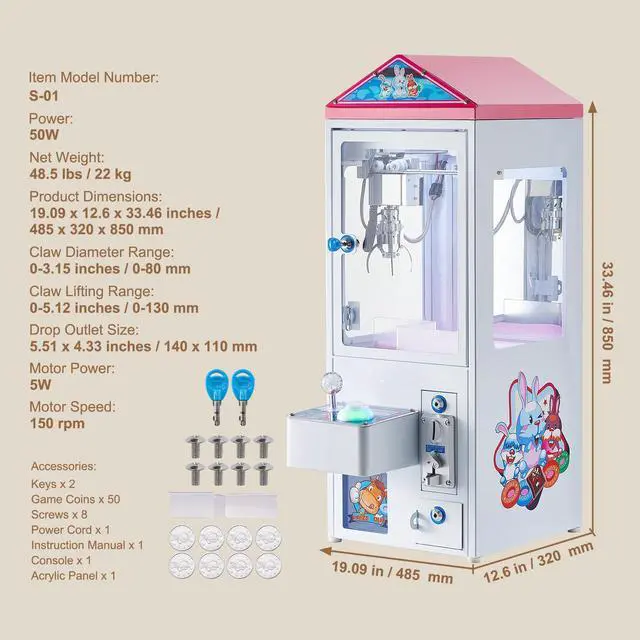 Motor Speed: 150 rpm,Item Model Number: S-01,Motor Power: 5W,Product Dimensions: 19.09 x 12.6 x 33.46 inches / 485 x 320 x 850 mm,Claw Diameter Range: 0-3.15 inches / 0-80 mm,Net Weight: 48.5 lbs / 22 kg,Claw Lifting Range: 0-5.12 inches / 0-130 mm,Power: 50W,Drop Outlet Size: 5.51 x 4.33 inches / 140 x 110 mm