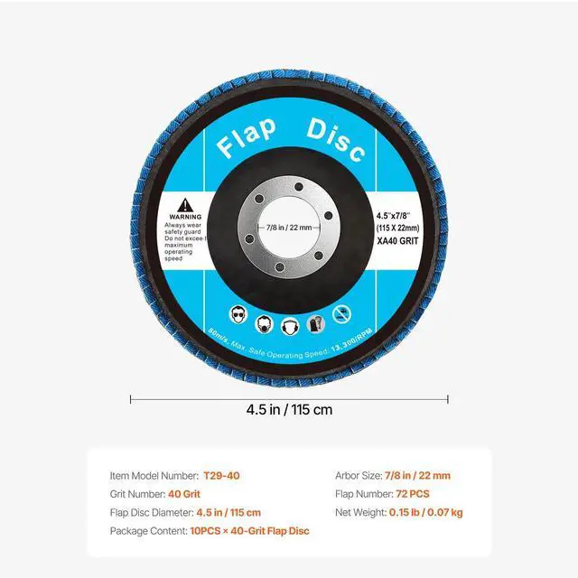Grit Number: 40 Grit,Flap Disc Diameter: 4.5 in / 115 cm,Arbor Size: 7/8 in / 22 mm,Item Model Number: T29-40,Net Weight: 0.15 lb / 0.07 kg,Flap Number: 72 pcs