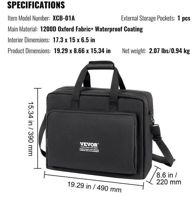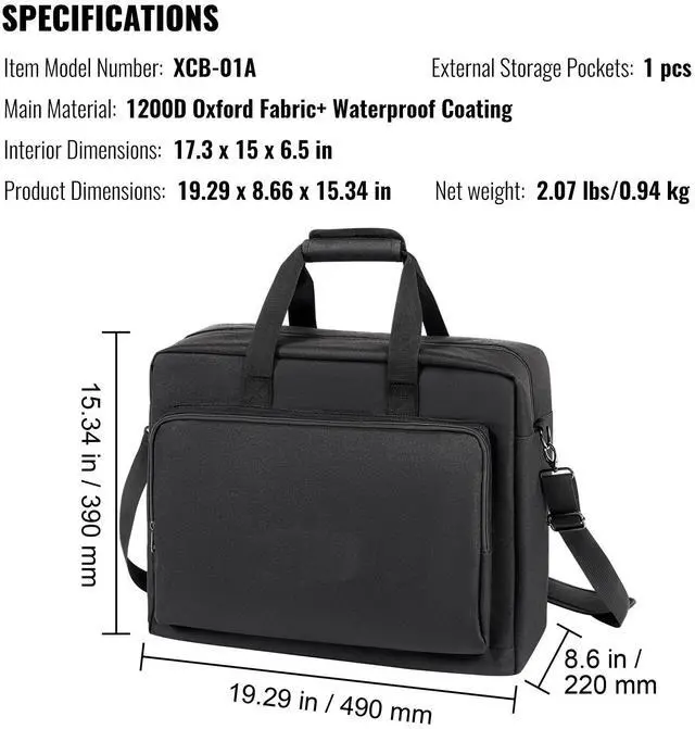 Interior Dimensions: 17.3 x 15 x 6.5 in/440 x 380 x 165 mm,Item Model Number: XCB-01A,External Storage Pockets: 1,Product Dimensions: 19.29 x 8.66 x 15.34 in/490 x 220 x 390 mm,Net Weight: 2.07 lbs/0.94 kg,Main Material: 1200D Oxford cloth + waterproof coating