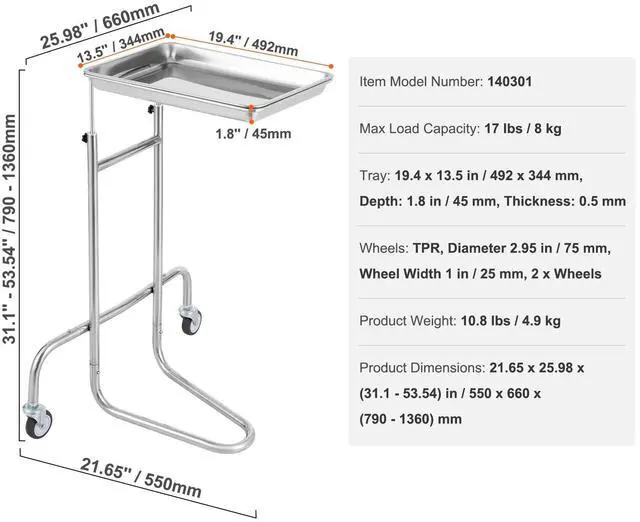 Tray: 19.4 x 13.5 in / 492 x 344 mm, Depth: 1.8 in / 45 mm, Thickness: 0.5 mm,Wheels: TPR, Diameter 6.4 in / 75 mm, Wheel Width 1 in / 25 mm, 2 x Wheels,Item Model Number: 140301,Product Weight: 4.9 lbs / 2.2 kg,Max Load Capacity: 16 lbs / 8 kg,Product Dimensions: 21.65 x 25.98 x (310.94 - 539.77) in / 550 x 660 x (790 - 1360) mm