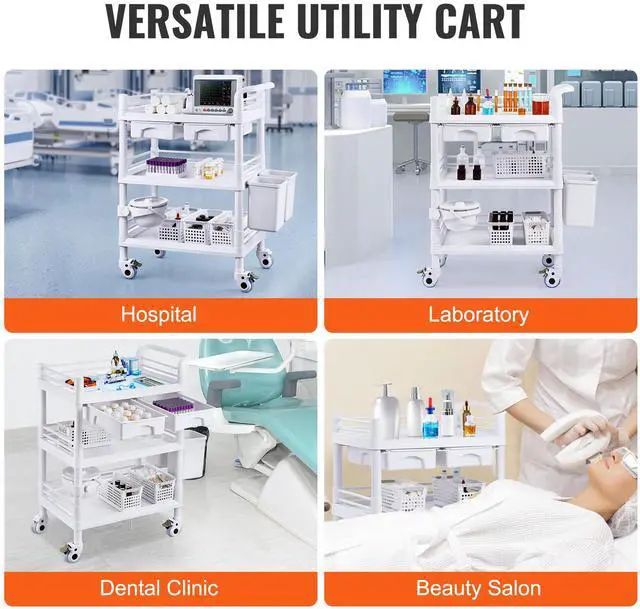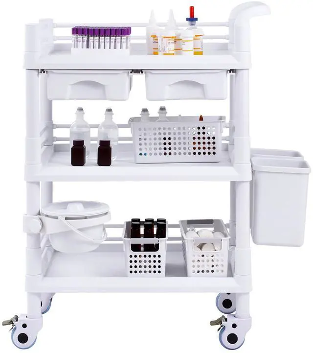 VEVOR 3 Tiers Lab Carts Mobile Medical Cart with 3 Trays & 3 Trash Cans White, Trolley Storage Cart with PP Material, Lab Rolling Cart with 4 Silent Wheels for Lab, Clinic, Hospital, Salon, Office