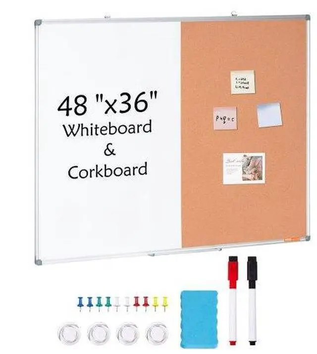 Whiteboard Panel Size: 33.9 × 22.8 in/860 × 580 mm,Panel: Whiteboard & Corkboard,Tray: Yes,Colors: White, Brown,Main Materials: Aluminum Frame + Steel Plate + Cork + 7-layer Corrugated Paper Backboard+Galvanized Sheet,Item Model Number: A01-4836CW,Wall Mounting: Horizontal/Vertical,Hooks: 2,Corkboard Panel Size: 33.9 × 22.8 in/860 × 580 mm,Product Dimensions: 35.4 × 47.2 × 0.8 in/900 × 1200 × 20 mm,Net Weight: 8.27 lbs/3.75 kg