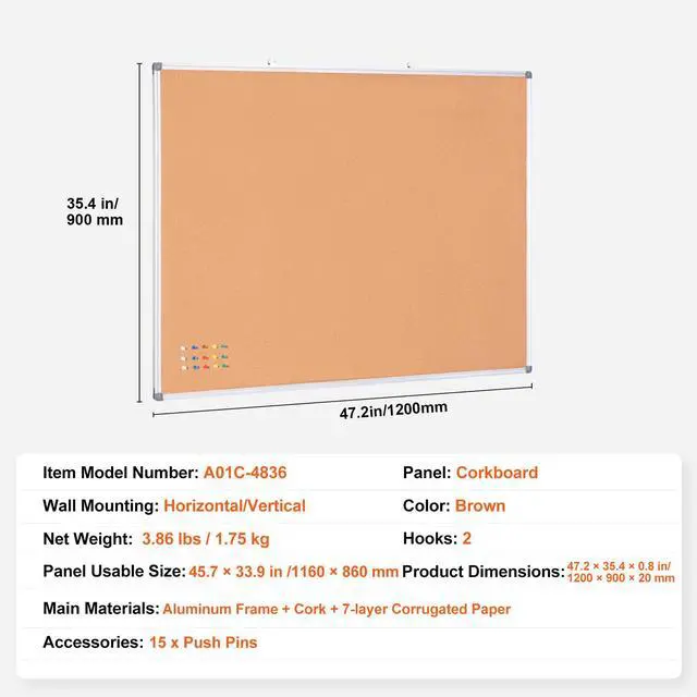 Panel: Corkboard,Tray: None,Main Materials: Aluminum Frame + Cork + 7-layer Corrugated Paper,Color: Brown,Item Model Number: A01C-4836,Wall Mounting: Horizontal/Vertical,Hooks: 2,Panel Usable Size: 45.7 × 33.9 in / 1160 × 860 mm,Product Dimensions: 47.2 × 35.4 × 0.8 in / 1200 × 900 × 20 mm,Net Weight: 3.86 lbs / 1.75 kg