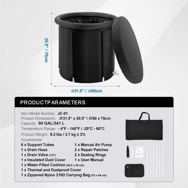 Capacity: 76.6 Gal / 290 L,Item Model Number: JC-01,Product Weight: 8.2 lbs / 3.7 kg ± 3%,Temperature Range: -4°F - 140°F / -20°C - 60°C,Product Dimensions: 31.5" x 29.5" / 800 x 750 mm