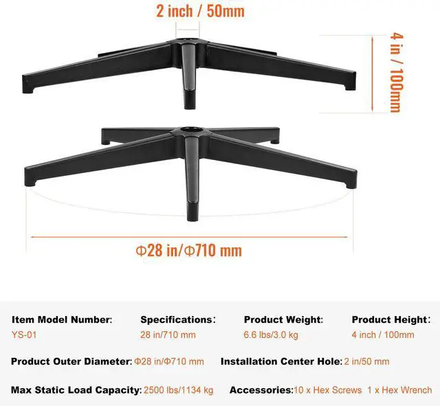 Product Height: 4 in/100 mm,Specifications: 28 in/710 mm,Product Outer Diameter: 28 in/710 mm,Item Model Number: YS-01,Max Static Load Capacity: 2500 lbs/1134 kg,Product Weight: 6.6 lbs/3.0 kg,Max Dynamic Load Capacity: 300 lbs/136 kg,Installation Center Hole: 2 in/50 mm