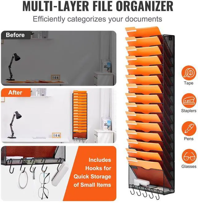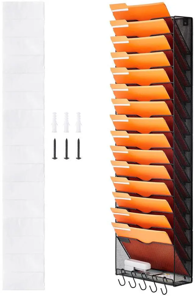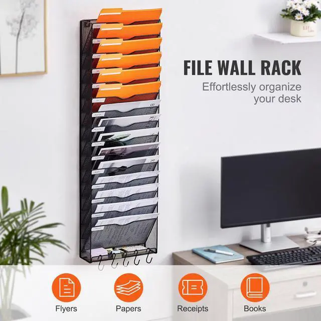 VEVOR Hanging Wall Files Organizer, 16-Tier Vertical Wall File Holder, Metal Wall Mounted Magazine Mail Paper Document Storage Folder, with Nametag Label, Bottom Flat Tray, for Office Home & School