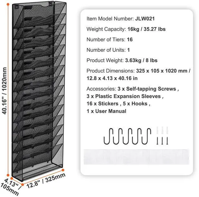 Weight Capacity: 16 kg / 35.27 lbs,Number of Units: 1,Number of Tiers: 16,Item Model Number: JLW021,Product Weight: 3.63 kg / 8 lbs,Product Dimensions: 325 x 105 x 1020 mm / 12.80 x 4.13 x 40.16 in