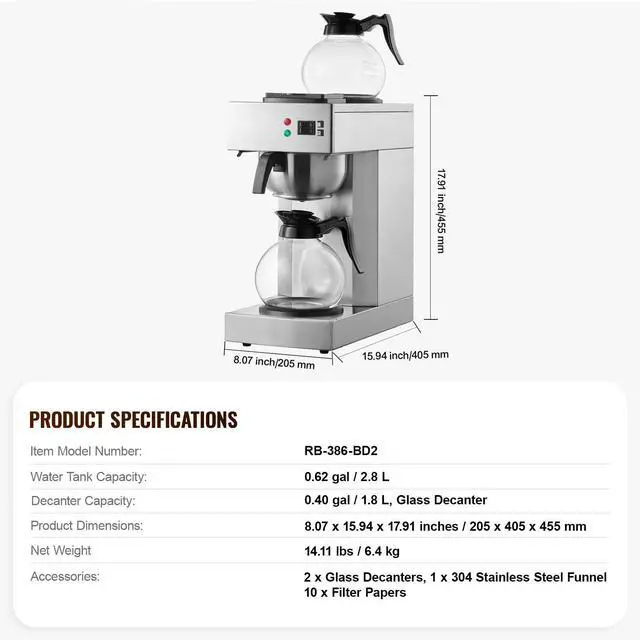 Water Tank Capacity: 0.62 gal / 2.8 L,Item Model Number: RB-386-BD2,Carafe Capacity: 0.40 gal / 1.8 L, Glass Carafe,Product Dimensions: 8.07 x 15.94 x 17.91 inches / 205 x 405 x 455 mm,Net Weight: 14.11 lbs / 6.4 kg