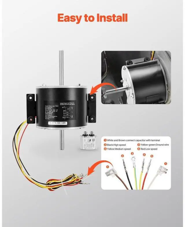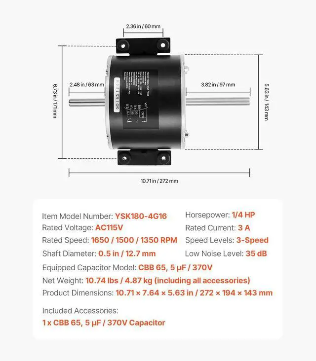 Equipped Capacitor Model: CBB 65, 5 µF / 370V,Rated Speed: 1650 / 1500 / 1350 RPM,Horsepower: 1/4 HP,Item Model Number: YDK180-4G16,Shaft Diameter: 0.5 in / 12.7 mm,Rated Current: 3 A,Speed Levels: 3-Speed,Product Dimensions: 10.71 x 7.64 x 5.63 in / 272 x 194 x 143 mm,Net Weight: 10.74 lbs / 4.87 kg (including all accessories),Rated Voltage: AC115V