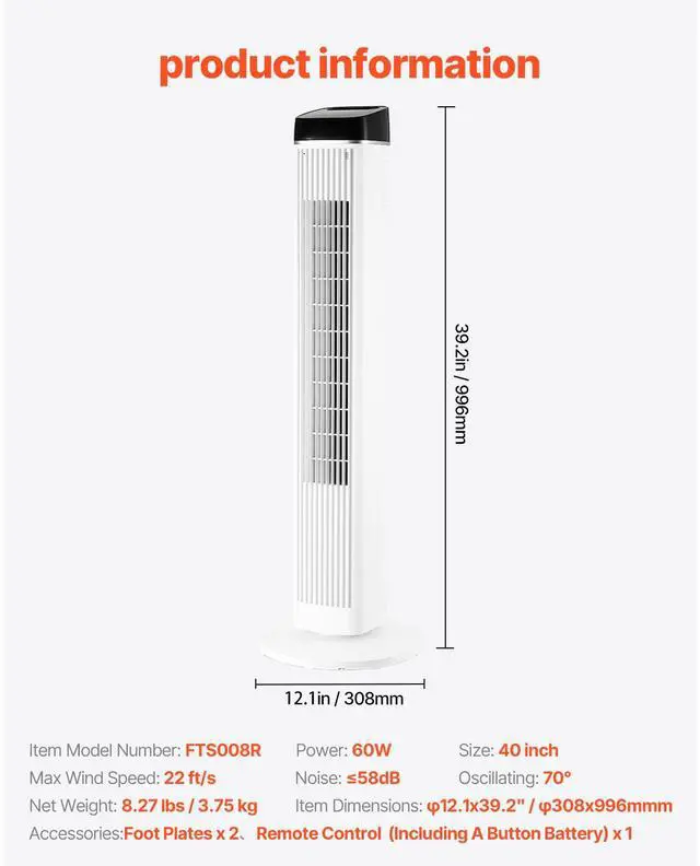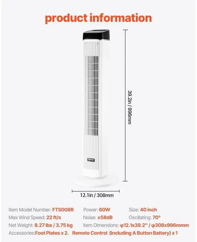 Max Wind Speed: 22 ft/s,Noise: 58dB,Size: 40 inch,Item Model Number: FTS008R,Oscillating: 70°,Item Dimensions: 12.1 x 39.2 inch / 308 x 996 mm,Net Weight: 7.39 lbs / 3.35 kg,Power: 60W