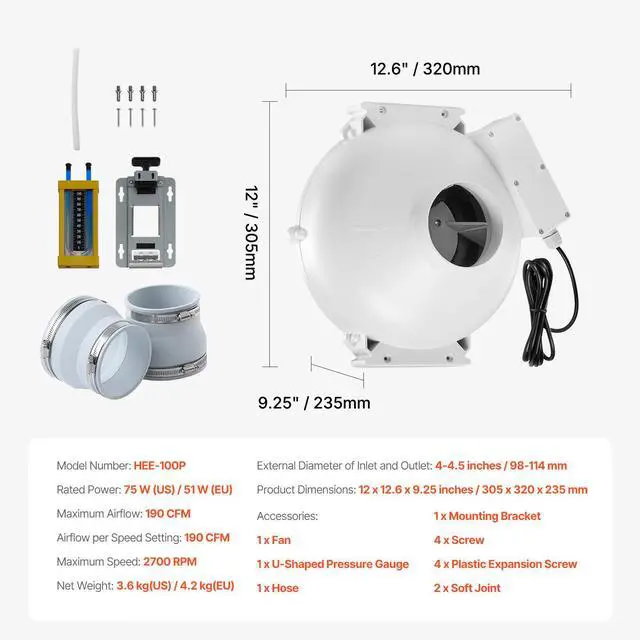 Maximum Speed: 2700 RPM,Item Model Number: HEE-100P,Airflow per Speed Setting: 190 CFM,Rated Power: 75 W (US) / 51 W (EU),Maximum Airflow: 190 CFM,Product Dimensions: 12 x 12.6 x 9.25 inches / 305 x 320 x 235 mm,External Diameter of Inlet and Outlet: 4-4.5 inches / 98-114 mm,Net Weight: 7.9 lbs / 3.6 kg (US), 9.26 lbs / 4.2 kg (EU)