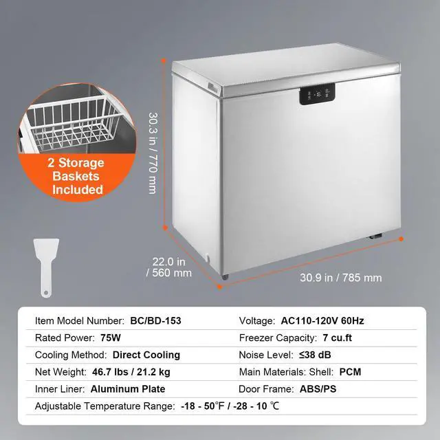 Freezer Capacity: 7 cu.ft / 198 L,Noise Level: 38 dB,Main Materials: Shell: PCM ; Inner Tank: Aluminum Plate ; Door Frame: ABS/PS,Cooling Method: Direct Cooling,Item Model Number: BD/BC-153EC,Rated Power: 75W,Adjustable Temperature Range: -18.4 - 50 / -28 - 10 ,Net Weight: 46.7 lbs / 21.2 kg