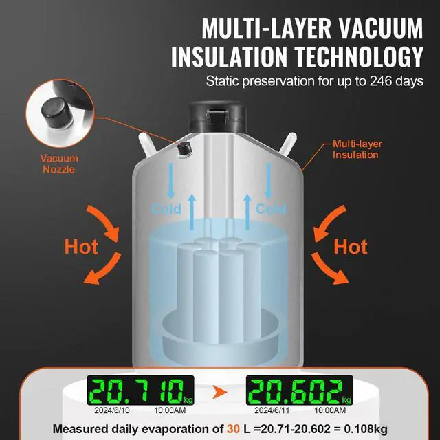 Daily Evaporation: 90~110 g/D,Capacity: 7.93 gal / 30L,Hole Diameter of Mouth: 1.96 in / 5 cm,Item Model Number: YDS-30,Canisters Quantity: 6pcs(2 without holes&4 with holes),Product Dimensions: 17.7 x 17.7 x 29.3 in / 449 x 449 x 745 mm,Net Weight: 16 kg / 35.3 lbs,Outer Dimensions of Container: 17.7 x 29.3 in / 44.9 x 74.5 cm,Static Preservation Time: 224~246 days