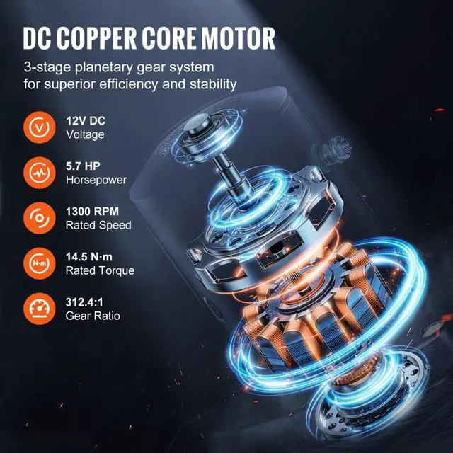 Waterproof Rating: IP55,Remote Control: Wireless + Wired Remote Control,Item Model Number: SEC16800T,Voltage/Horsepower: 12V DC/5.7 HP,Cable Material: Steel, 19 Strands,Cable Specifications: 7/16 in x 85 ft/1.1 x 2590.8 cm,Gear Ratio: 312.4:1,Item Dimensions: 22.4 x 7.6 x 8.5 in/56.9 x 19.3 x 21.7 cm,Rated Line Pull Capacity: 18000 lbs/8165 kg,Net Weight: 96.8 lbs/43.9 kg,Main Material: Alloy Aluminum, Steel, Copper, Plastic (PPS and PA, etc.),Wireless Remote Control Distance: 65.61 ft/20 m