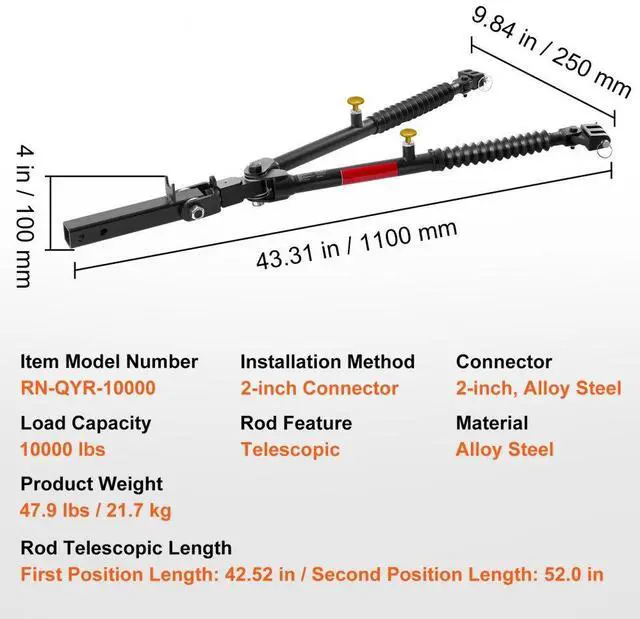 Installation Method: 2-inch Connector,Load Capacity: 10000 lbs/4535 kg,Item Model Number: RN-QYR-10000,Rod Feature: Telescopic,Product Weight: 47.9 lbs/21.7 kg,Material: Alloy Steel,Product Size: 43.31 x 9.84 x 4 in/1100 x 250 x 100 mm