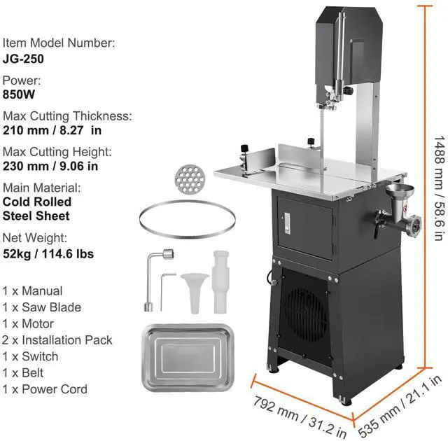 Item Model Number: JG-250,Max Cutting Thickness: 180 mm / 7.09 in,Worktable Size: 15 x 19.1 inches / 380 x 485 mm,Saw Blade Size: 82.3 x 0.63 x 0.02 inches / 2090 x 16 x 0.56 mm,Max Cutting Height: 250 mm / 9.84 in,Net Weight: 114.6 lbs / 52 kg,Power: 850W,Main Material: Cold Rolled Steel Sheet,Product Size: 31.2 x 21.1 x 58.6 inches / 792 x 535 x 1488 mm