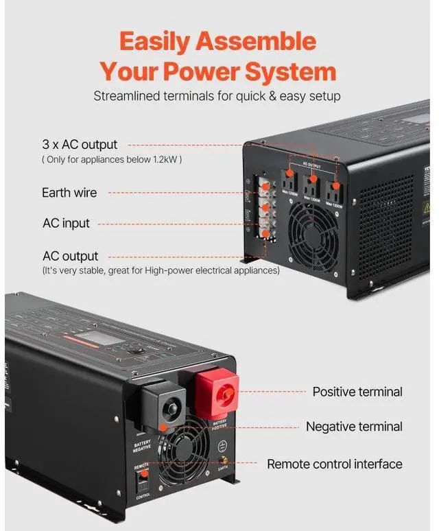 Charging Current: 50A / 30A / 20A / 10A,Item Model Number: BL-W2012V-L,Rated Power & Peak Power: 2000W / 6000W,Conversion Voltage: DC 12V to AC 120V,Compatible Battery Types: 12V LiFePO4, Lithium-ion, AGM, Sealed Lead-Acid, and Open Lead-Acid,Net Weight: 33.9 lbs / 15.38 kg,Output Waveform: Pure Sine Wave