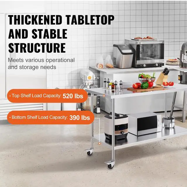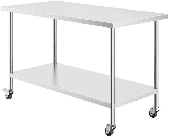 VEVOR Stainless Steel Work Table 30 x 60 x 38 Inch, with 4 Wheels, 3 Adjustable Height Levels, Heavy Duty Food Prep Worktable for Commercial Kitchen Restaurant, Silver