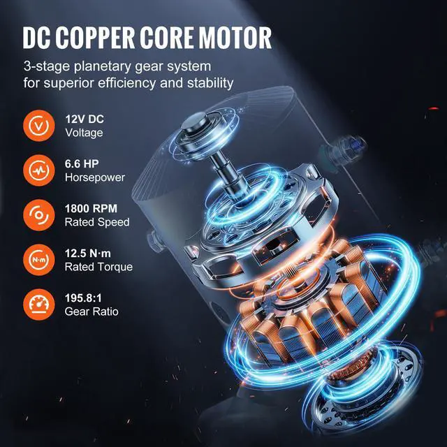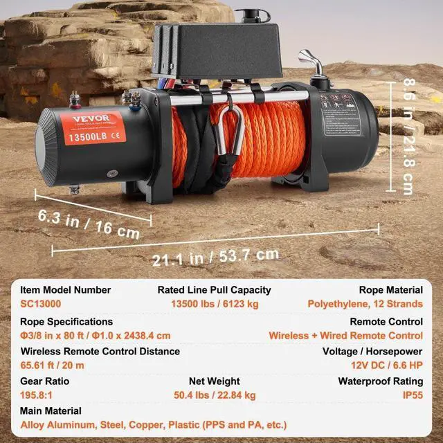 Waterproof Rating: IP55,Remote Control: Wireless + Wired Remote Control,Rope Material: Polyethylene, 12 Strands,Item Model Number: SC13000,Voltage/Horsepower: 12V DC/6.6 HP,Gear Ratio: 195.8:1,Item Dimensions: 21.1 x 6.3 x 8.6 in/53.7 x 16 x 21.8 cm,Rated Line Pull Capacity: 13500 lbs/6123 kg,Rope Specifications: 3/8 in x 80 ft/1.0 x 2438.4 cm,Net Weight: 50.4 lbs/22.84 kg,Main Material: Alloy Aluminum, Steel, Copper, Plastic (PPS and PA, etc.),Wireless Remote Control Distance: 65.61 ft/20 m