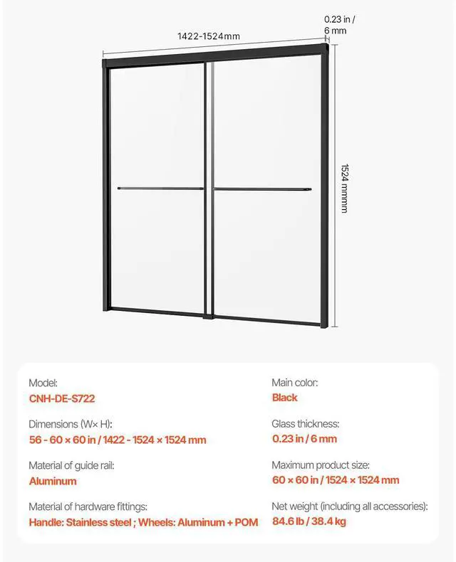 Max Product Size (W x H): 60 x 60 in / 1524 x 1524 mm,Track Material: Aluminum,Main Color: Black,Net Weight (Including All Accessories): 84.6 lb / 38.4 kg,Dimensions (W x H): 56-60 x 60 in / 1422-1524 x 1524 mm,Item Model Number: CNH-DE-S722,Glass Thickness: 0.23 in / 6 mm,Handle Material: Stainless Steel,Wheel Material: Aluminum + POM