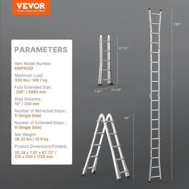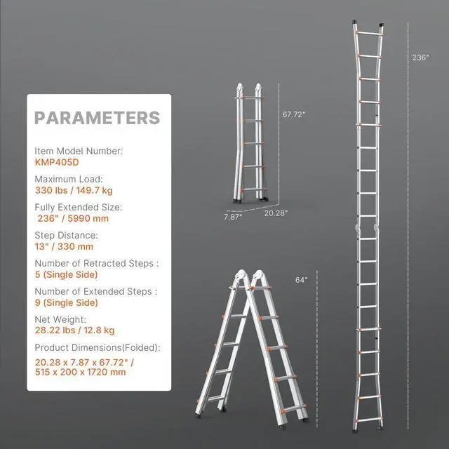 Number of Retracted Steps (Single Side): 5,Number of Extended Steps (Single Side): 9,Maximum Load: 330 lbs / 149.7 kg,Fully Extended Size: 236" / 5990 mm,Step Distance: 13" / 330 mm,Item Model Number: KMP405D,Product Dimensions (Folded): 20.28 x 7.87 x 67.72" / 515 x 200 x 1720 mm,Net Weight: 28.22 lbs / 12.8 kg