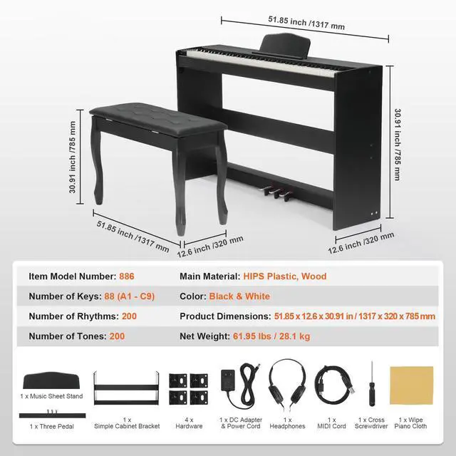 Number of Keys: 88 (A1 - C9),Number of Rhythms: 200,Number of Tones: 200,Color: Black & White,Item Model Number: 886,Product Dimensions: 51.85 x 12.6 x 30.91 in / 1317 x 320 x 785 mm,Net Weight: 61.95 lbs / 28.1 kg,Main Material: HIPS Plastic, Wood