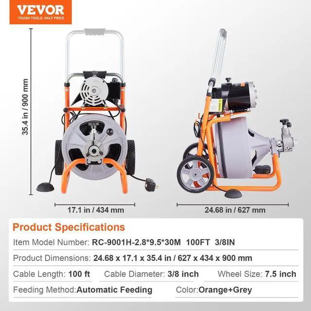 Wheel Size: 7.5 inch,Color: Orange + Grey,Item Model Number: RC-9001H-2.8*9.5*30M 100FT 3/8IN,Feeding Method: Automatic Feeding,Cable Diameter: 3/8 inch,Cable Length: 100 ft,Product Dimensions: 24.68 x 17.1 x 35.4 in / 627 x 434 x 900 mm,Net Weight: 66.1 lbs / 30 kg (including all accessories)
