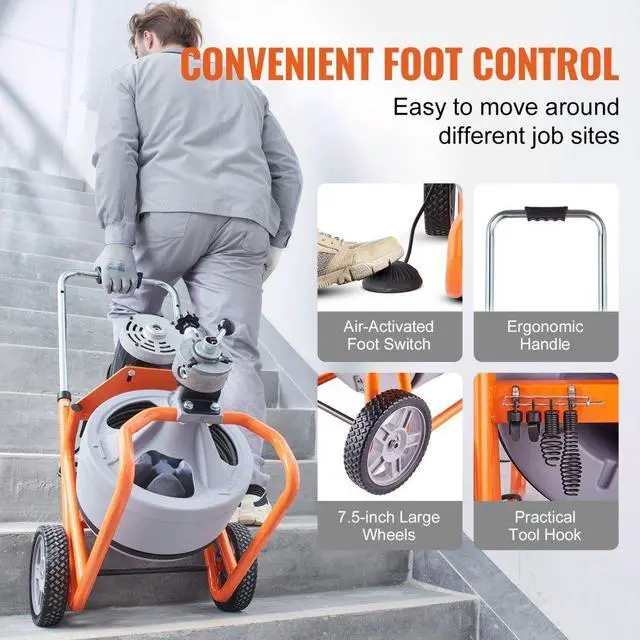 VEVOR Drain Cleaner Machine 100FT x 3/8 Inch Auto Feed with Wheels & 8 Cutters
