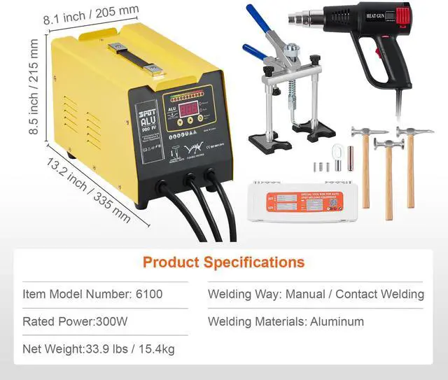Welding Material: Aluminum,Item Model Number: 6100,Rated Power: 300W,Product Dimensions: 13.2 x 8.1 x 8.5 inch / 335 x 205 x 215 mm,Net Weight: 33.9 lbs / 15.4 kg,Welding Way: Manual / Automatic Welding