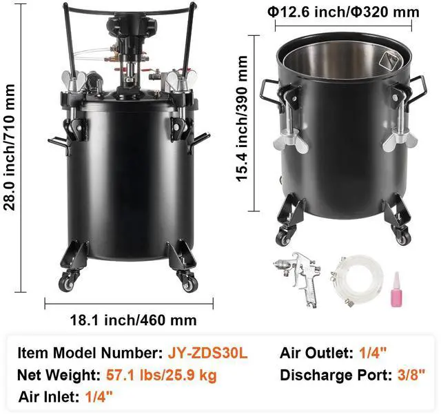 Air Inlet: 1/4",Item Model Number: JY-ZDS30L,Air Outlet: 1/4",Discharge Port: 3/8",Net Weight: 57.1 lbs/25.9 kg