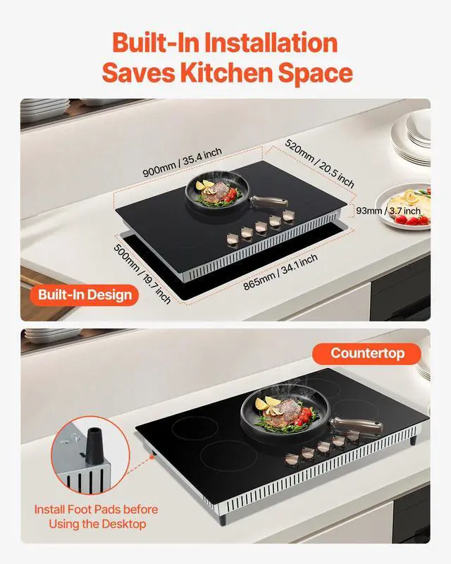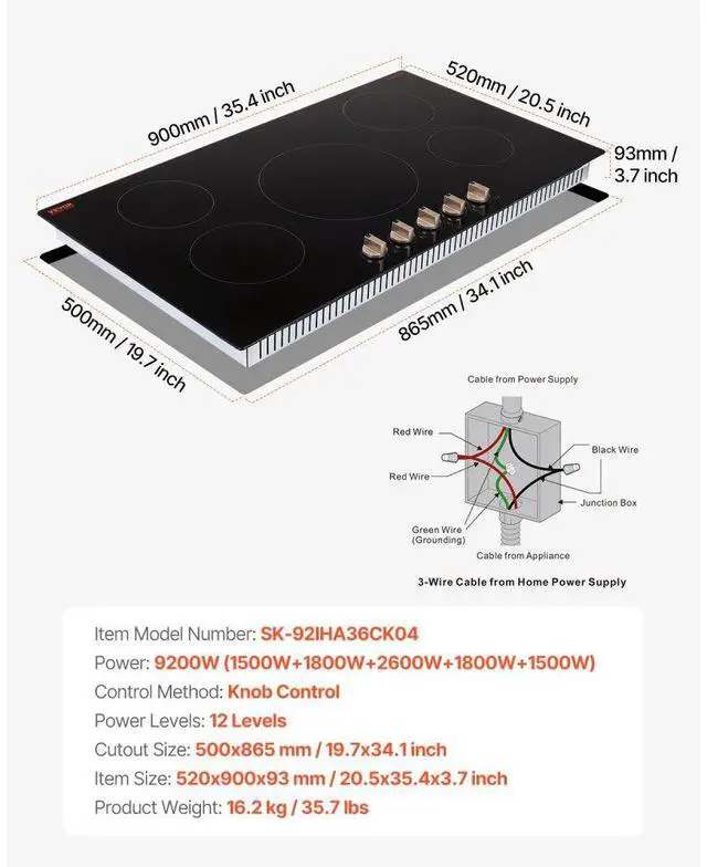 Cutout Size: 865x500 mm / 34.1x19.7 inch,Item Size: 900x520x93 mm / 35.4x20.5x3.7 inch,Control Method: Knob Control,Item Model Number: SK-92IHA36CK04,Product Weight: 16.2 kg / 35.7 lbs,Power: 9200W,Power Levels: 12 Levels