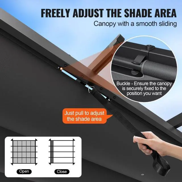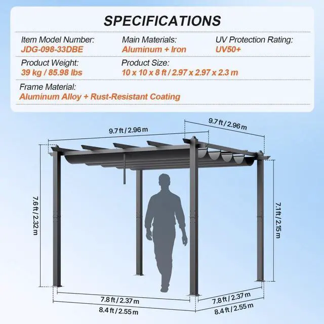 Main Materials: Aluminum + Iron,UV Protection Rating: UV50+,Item Model Number: JDG-098-33DBE,Product Weight: 90.6 lbs / 41.1 kg,Frame Material: Aluminum Alloy + Rust-Resistant Coating,Product Size: 10 x 10 x 8 ft / 2.97 x 2.97 x 2.3 m