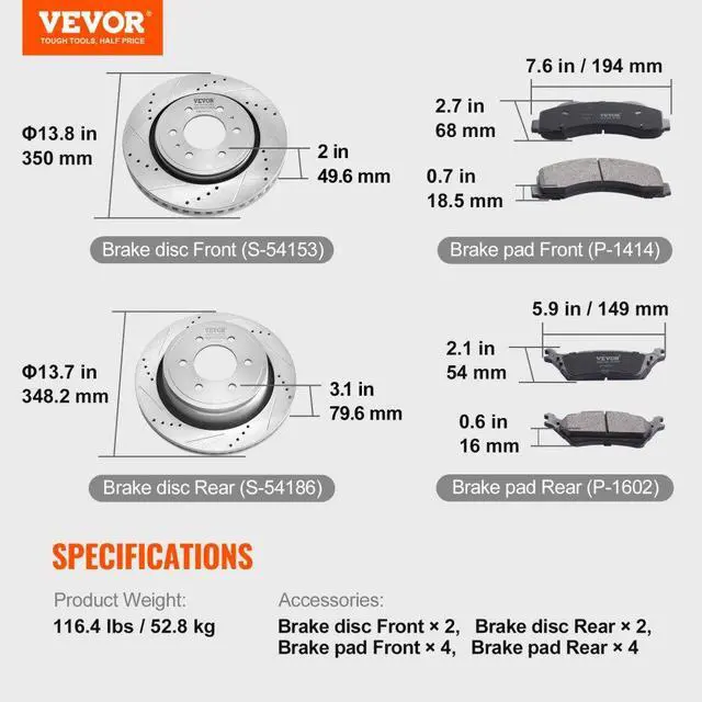 Compatible Vehicle Models: 2012-2014 Ford F-150 (6-Lug Models), 2015-2020 Ford F-150 (Models with Manual Parking Brake),Brake Rotor Size: 13.8×2.0 inch/350×49.6 mm (Front), 13.7×3.1 inch/348.2×79.6 mm (Rear),Item Model Number: 54153/21373,Product Weight: 116.4 lbs/52.8 kg,Brake Pad Size: 7.6×2.7×0.7 inch/194×68×18.5 mm (Front), 5.9×2.1×0.6 inch/149×54×16 mm (Rear),Brake Pad Part Number: P-1414 (Front), P-1602 (Rear),Main Material: Brake Disc: Cast Iron (HT250), Brake Pad: Ceramic,Brake Rotor Part Number: S-54153 (Front), S-54186 (Rear)