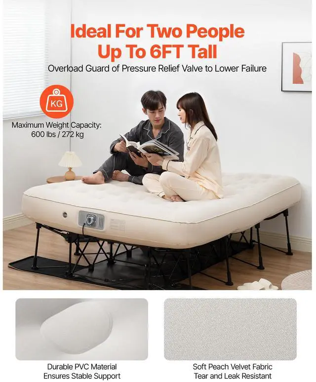 Mattress Dimensions: 77.56x60.24x11.02 in / 1970x1530x280 mm,Recommended Weight Capacity: 600 lbs / 272 kg,Item Model Number: BF004,Product Weight: 37.57 lbs / 17.04 kg,Inflation/Deflation Time: 3 Minutes,Material: PVC + Peach Skin Velvet,Bed Frame Dimensions: 56.69 x 62.99 x 16.93 inches / 1440 x 1600 x 430 mm,Product Dimensions: 77.56x60.24x24.8 in /1970x1530x630 mm