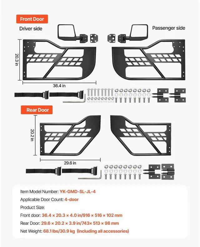 Rear Door: 29.6 x 20.2 x 3.9 in/743x 513 x 98 mm,Front door: 36.4 x 20.3 x 4.0 in/916 x 516 x 102 mm,Item Model Number: YK-GMD-SL-JL-4,Applicable Door Count:4-door,Net Weight: 68.1 lbs/30.9 kg (Including all accessories)