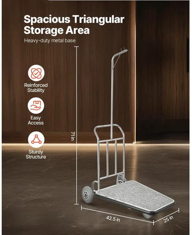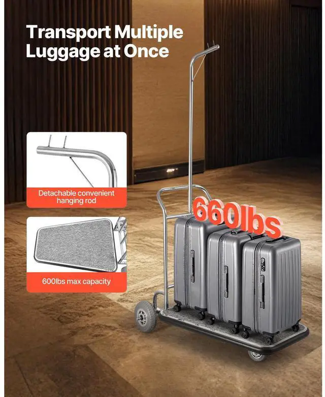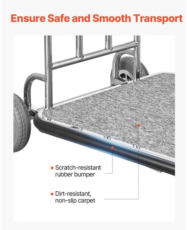 VEVOR Luggage Cart 600 LBS 3 Wheel Stainless Steel Finish Bellman's Cart