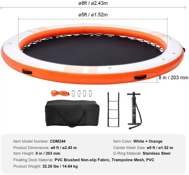 Item Color: White + Orange,Item Dimension: ø8 ft / ø2.43 m,Float Material: PVC Brushed Non-slip Fabric, Trampoline Mesh, PVC,Item Height: 8 in/ 203 mm,Item Model Number: CDM244,D-Ring Material: Stainless Steel,Product Weight: 32.28 lbs / 14.64 kg,Center Mesh Size: ø5 ft / ø1.52 m