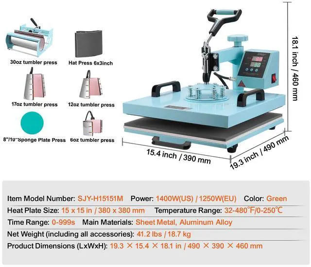 Heat Plate Size: 15 x 15 in / 380 x 380 mm,Main Materials: Sheet Metal, Aluminum Alloy,Net Weight (including all accessories): 41.2 lbs / 18.7 kg,Time Range: 0-999s,Color: Green,Item Model Number: SJY-H15151M,Temperature Range: 32-480/0-250,Power: 1400W(US) / 1250W(EU)