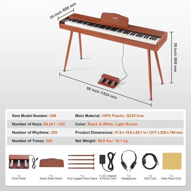 Number of Keys: 88 (A1 - C9),Number of Rhythms: 200,Number of Tones: 200,Color: Black & White, Light Brown,Item Model Number: 886,Product Dimensions: 51.9 x 12.6 x 29.1 in / 1317 x 320 x 740 mm,Net Weight: 39.9 lbs / 18.1 kg,Main Material: HIPS Plastic, Q235 Iron