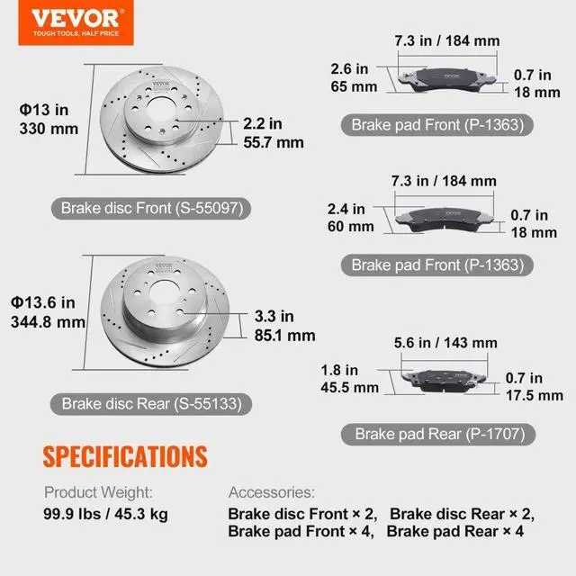 Compatible Vehicle Models: 2014-2018 Chevy Silverado GMC Sierra 1500, 15-2020 Suburban Tahoe Yukon XL Escalade ESV,Brake Rotor Size: 13×2.2 inch/330×55.7 mm (Front), 13.6×3.3 inch/344.8×85.1 mm (Rear),Item Model Number: 55097/55133,Product Weight: 99.9 lbs/45.3 kg,Brake Pad Size: 5.8×2.5×0.7 inch/146.5×63×17 mm (Front), 7.3×2.4×0.7 inch/184.4×60×18mm (Front), 5.6×1.8×0.7 inch/143×45.5×17.5mm (Rear),Brake Pad Part Number: P-1363 (Front), P-1707 (Rear),Main Material: Brake Disc: Cast Iron (HT250), Brake Pad: Ceramic,Brake Rotor Part Number: S-55097 (Front), S-55133 (Rear)