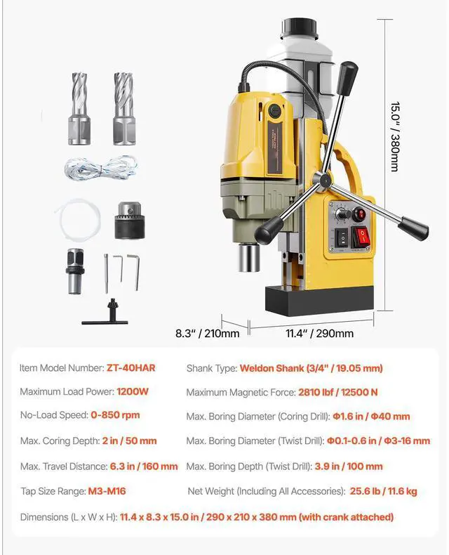 Net Weight (Including All Accessories): 25.6 lb / 11.6 kg,Maximum Load Power: 1200W,Max. Boring Diameter (Coring Drill): 1.6 in / 40 mm,Maximum Magnetic Force: 2810 lbf / 12500 N,Tap Size Range: M3-M16,Item Model Number: ZT-40HAR,No-Load Speed: 0-850 rpm,Max. Boring Diameter (Twist Drill): 0.1-0.6 in / 3-16 mm,Shank Type: Weldon Shank (3/4" / 19.05 mm),Max. Coring Depth: 2 in / 50 mm,Max. Boring Depth (Twist Drill): 3.9 in / 100 mm,Max. Travel Distance: 6.3 in / 160 mm