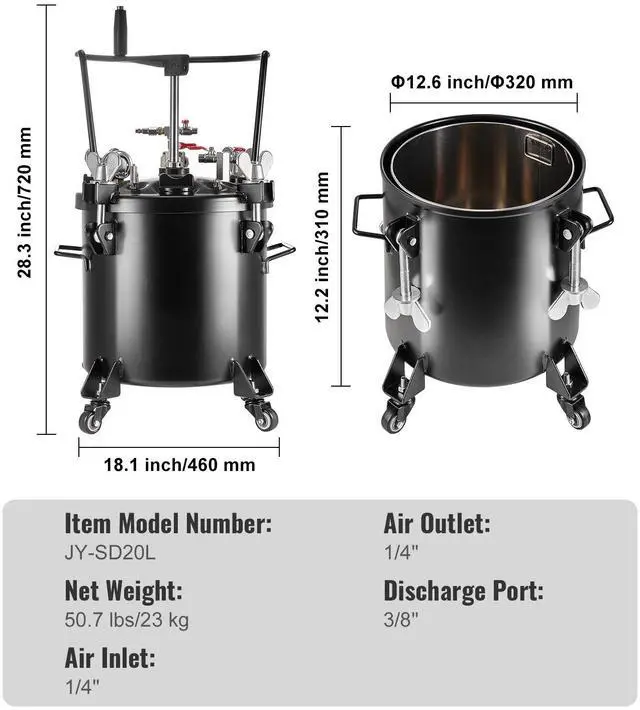 Air Inlet: 1/4",Item Model Number: JY-SD20L,Air Outlet: 1/4",Discharge Port: 3/8",Net Weight: 50.7 lbs/23 kg