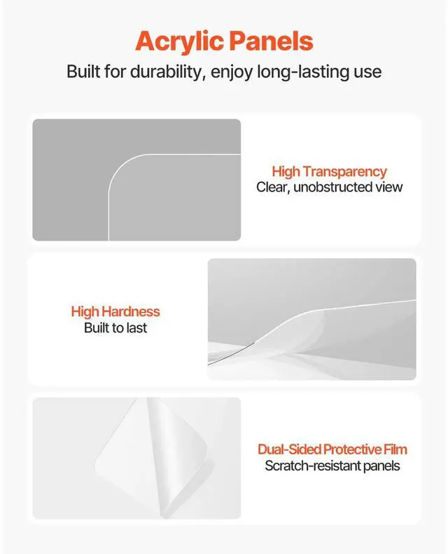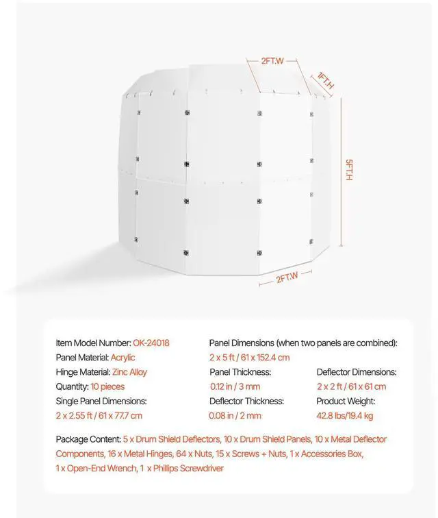 Hinge Material: Zinc Alloy,Deflector Dimensions: 2 x 2 ft / 61 x 61 cm,Panel Dimensions (when two panels are combined): 2 x 5 ft / 61 x 152.4 cm,Single Panel Dimensions: 2 x 2.55 ft / 61 x 77.7 cm,Panel Thickness: 0.12 in / 3 mm,Item Model Number: OK-24018,Panel Material: Acrylic,Product Weight: 42.8 lbs/19.4 kg,Quantity: 10 pieces,Deflector Thickness: 0.08 in / 2 mm