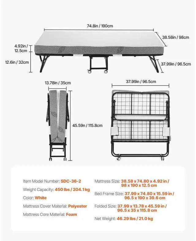 Weight Capacity: 450 lbs / 204.1 kg,Bed Frame Size: 37.99 x 74.80 x 15.59 in / 965 x 1900 x 396 mm,Color: White,Item Model Number: SDC-36-2,Folded Size: 37.99 x 13.78 x 45.59 in / 965 x 350 x 1158 mm,Mattress Cover Material: Polyester,Net Weight: 46.29 lbs / 21.0 kg,Mattress Core Material: Foam,Mattress Size: 38.58 x 74.80 x 4.92 in / 980 x 1900 x 125 mm