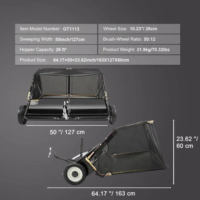 Sweeping Width: 50"/127 cm,Hopper Capacity: 26 ft³,Wheel Size: 10.5"/26.7 cm,Main Materials: Iron, PP, PVC, Polyester,Brush-Wheel Ratio: 50:12,Product Size (L x W x H): 66.9" x 57.1" x 24.4"/170 x 145 x 62 cm,Color: Black,Item Model Number: GT1113,Product Weight: 74.5 lbs/33.8 kg,Hopper Bag Material: Nylon,Finish: Painting