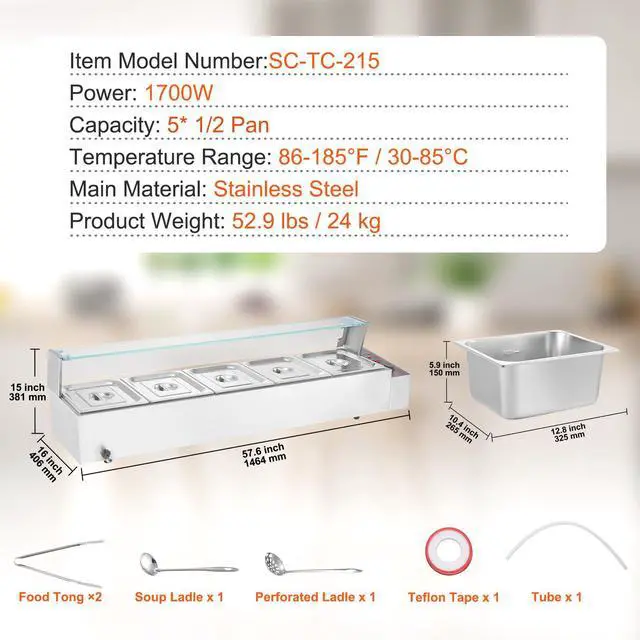 Capacity: 5 x 8QT,Item Model Number: SC-TC-215,Product Weight: 27.5 kg / 60.6 lbs,Temperature Range: 86-185°F / 30-85°C,Power: 1700W,Main Material: Stainless Steel,Product Size: 1464 x 378 x 381 mm / 57.6 x 16 x 15 in